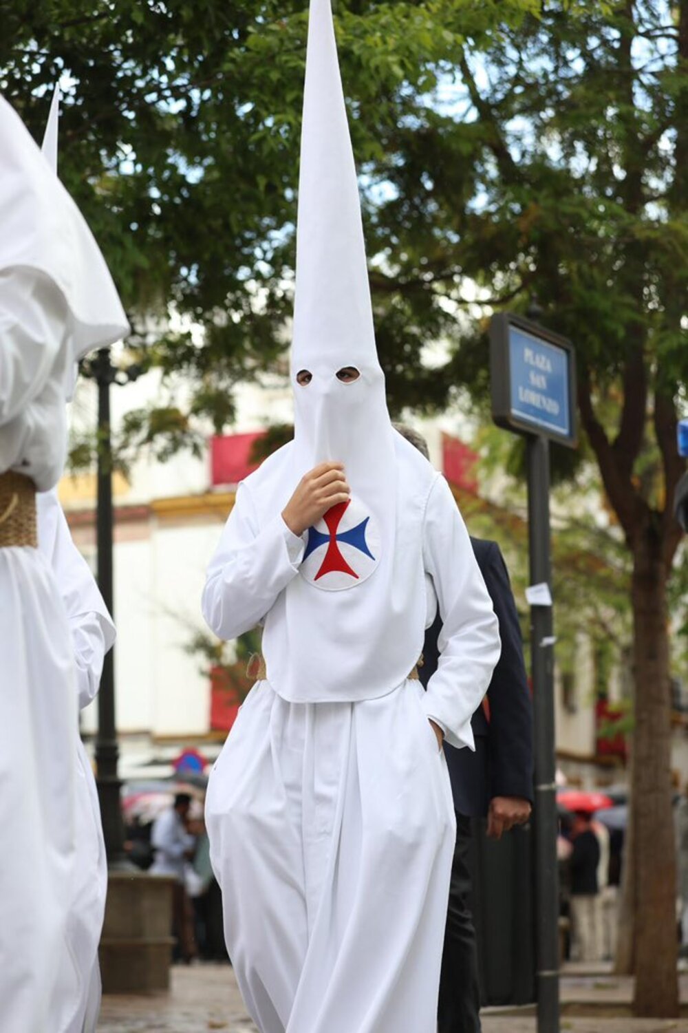 Prendido sobre el antifaz, a la altura del pecho se sitúa la Cruz Trinitaria, con un brazo vertical de color rojo y montando sobre el otro horizontal de color azul, calcetín blanco y sandalias de color negro.
